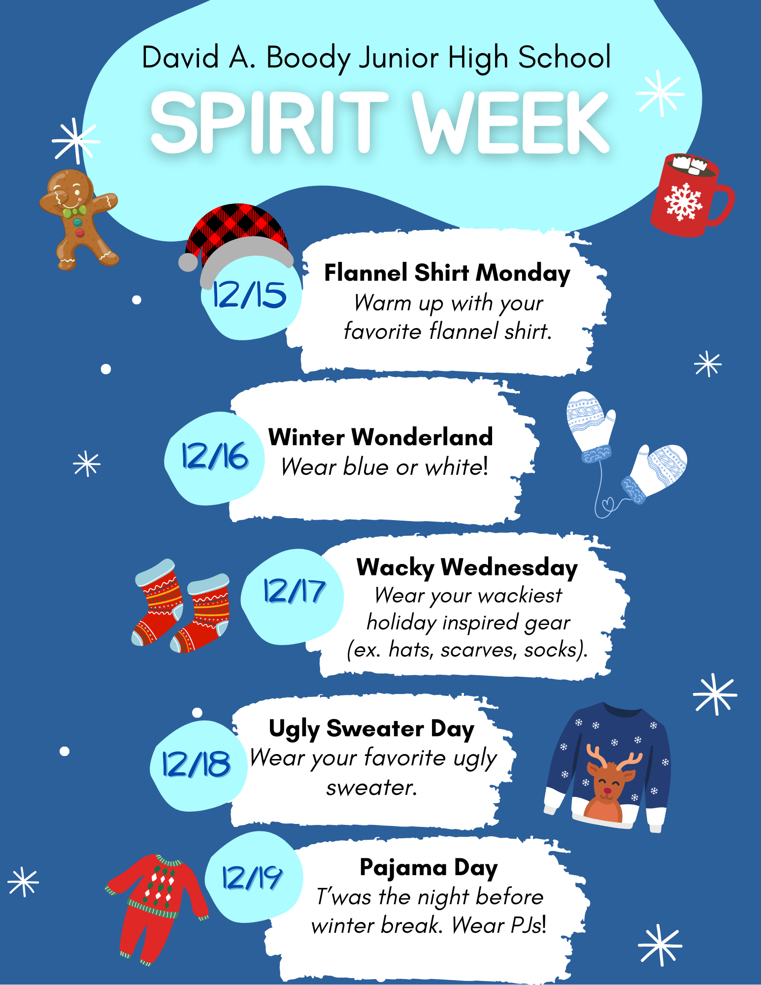 HOLIDAY SPIRIT WEEK December 15: Flannel Shirt Monday December 16: Winter Wonderland, Wear Blue and/or white December 17: Wacky Wednesday, Wear your wackiest holiday gear December 18: Ugly Sweater Day December 19: Pajama Day Published December 2, 2025 Print