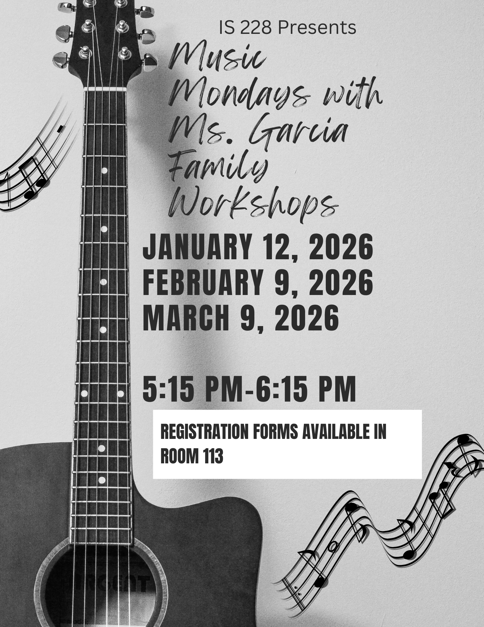 We’re excited to introduce Music Mondays, IS 228’s newest family workshop! Sign up for this three-part series with Ms. Garcia to explore reading music, playing, and so much more.