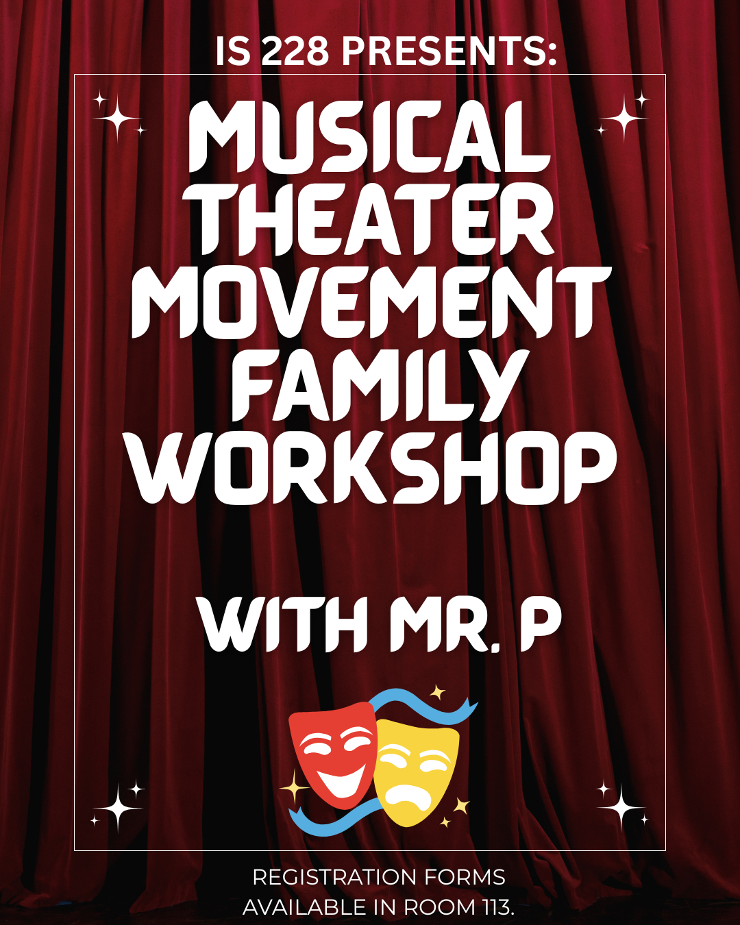 We’re excited to introduce Musical Theater Movement, IS 228’s newest family workshop! Sign up for this two part series with Mr. P to explore creativity, confidence and connection through Broadway Style Choreography!