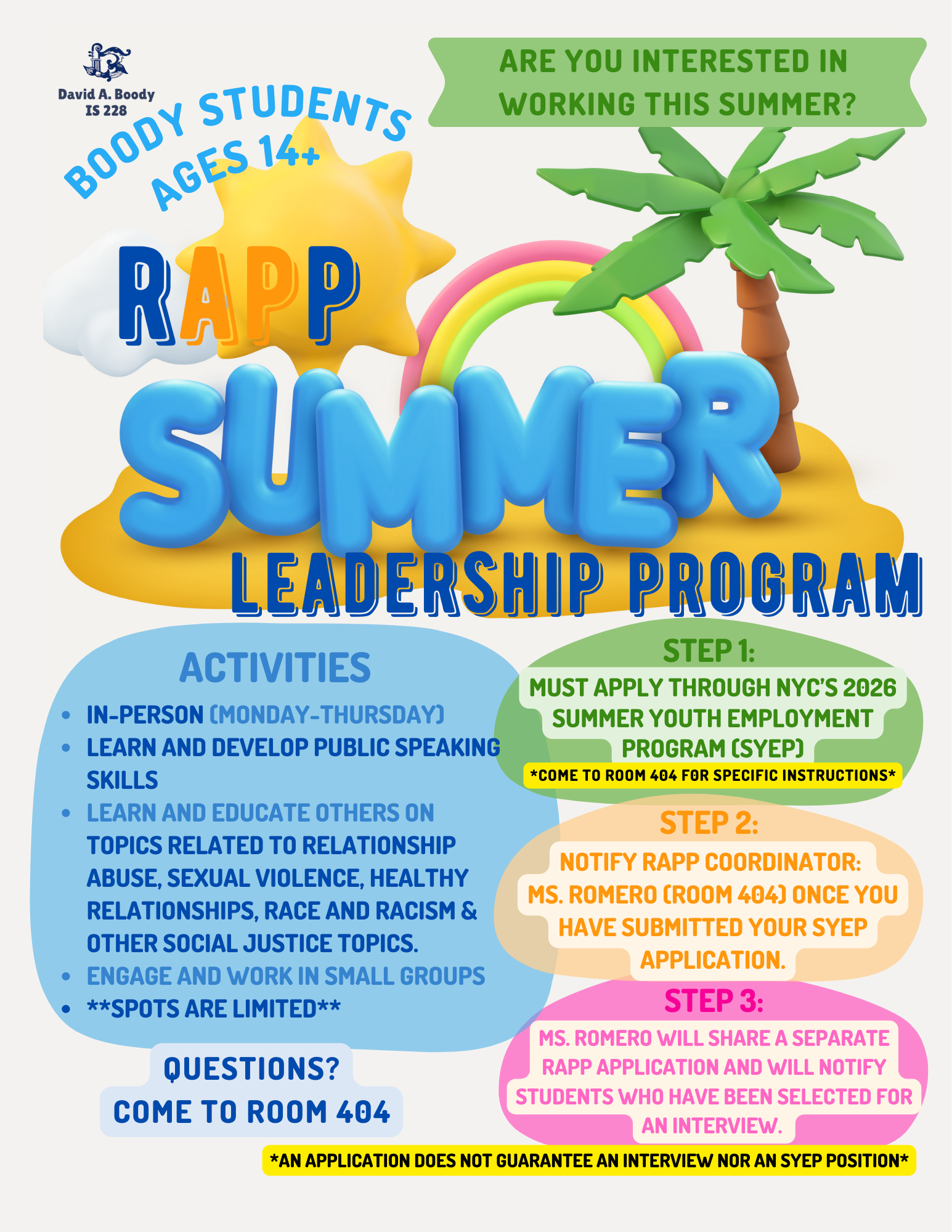 To be considered, students must first apply for the NYC 2026 Summer Youth Employment Program (SYEP) and speak with our RAPP Coordinator, Ms. Romero, in room 404.