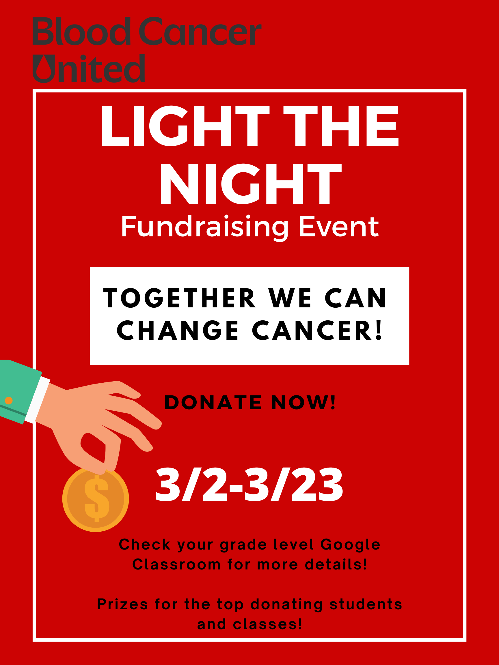 We invite you to join our school as we fundraise to help end blood cancers. See below on how to make Cash, change and online deposits!