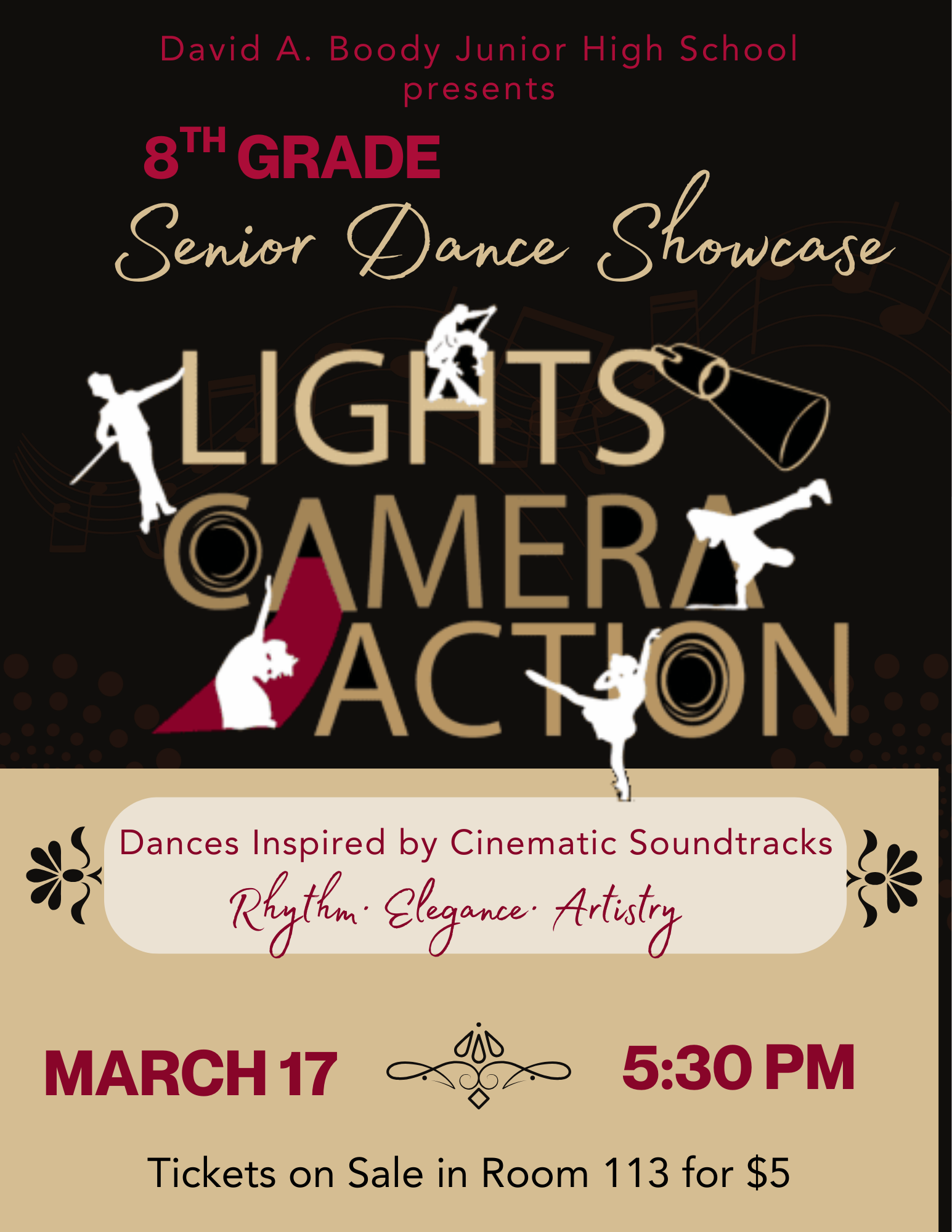8th Grade Dance Showcase Students may purchase tickets in the Main Office during their scheduled lunch period for a $5 donation The show is scheduled for Tuesday, March 17th at 5:30pm. Published February 27, 2026 Print