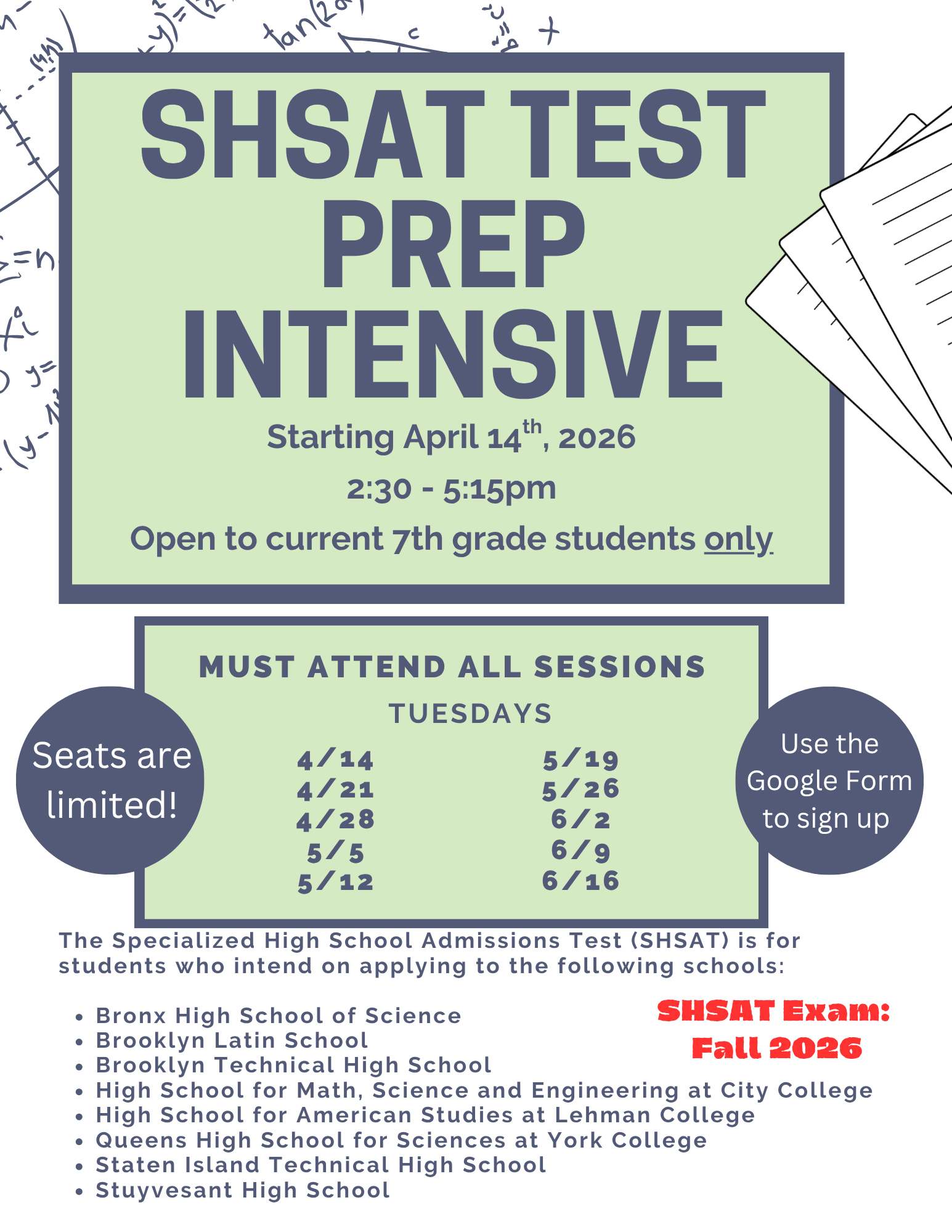 Are you interested in attending one of NYCโs Specialized High Schools (like Bronx Science, Stuyvesant, or Brooklyn Tech)? Now is the time to start preparing! We are opening registration for our 7th Grade SHSAT Prep Program.